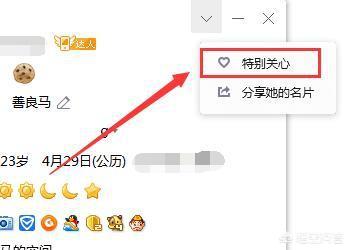 4、点开“三角”标志后,出现“特别关心”字样,点击即可快速设置“特别关心”提示(现在拥有好友特别提示音和空间动态更新提示了)。