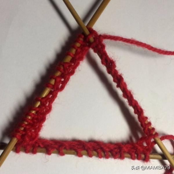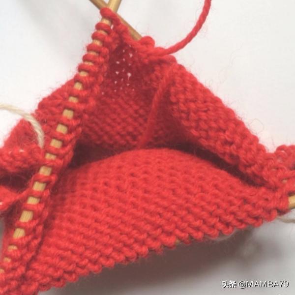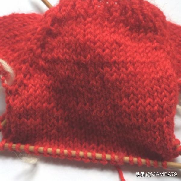 3、接下来开始织下针部分。在每一根针的开头第2针和最后一针前,圈加一针。开头以起头的毛线做为标记,加完针后继续织一圈下针,以此循坏该步骤。