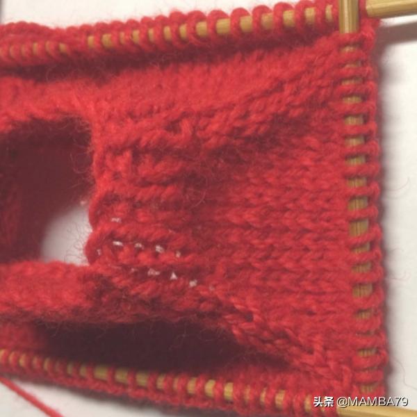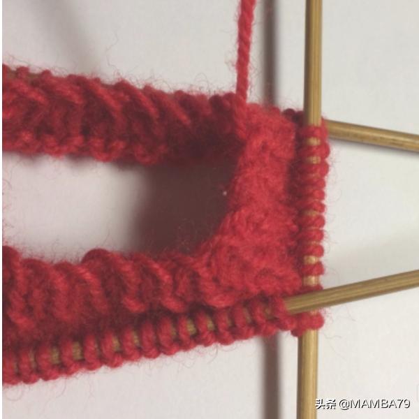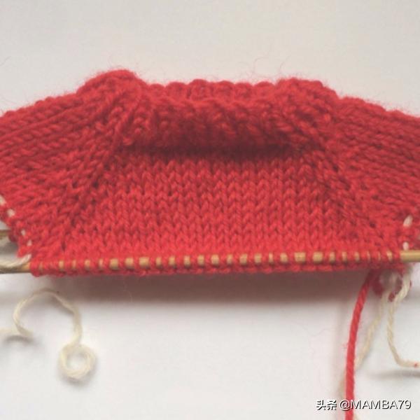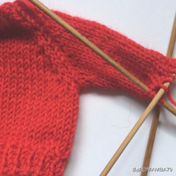 8、接下来,我们把一处肩膀的线圈挑在3根针上,开始编织袖子部分。