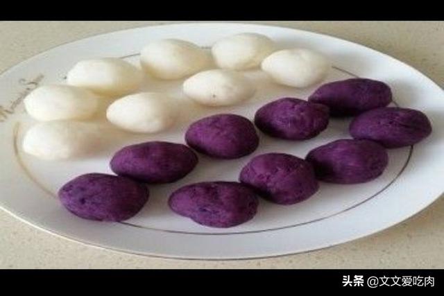 4、蒸好的山药和紫薯压成泥后分别加入适量蜂蜜搅拌后然后搓成小圆团(喜欢吃甜的可以多加点蜂蜜)