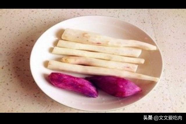 2、先将山药切成几段然后用刨刀去掉紫薯和山药的皮(山药切小段比较好去皮)