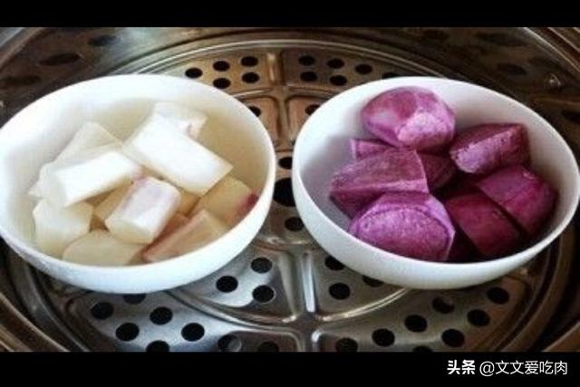3、将紫薯和山药切好洗净放进碗里然后放进蒸格蒸至软掉